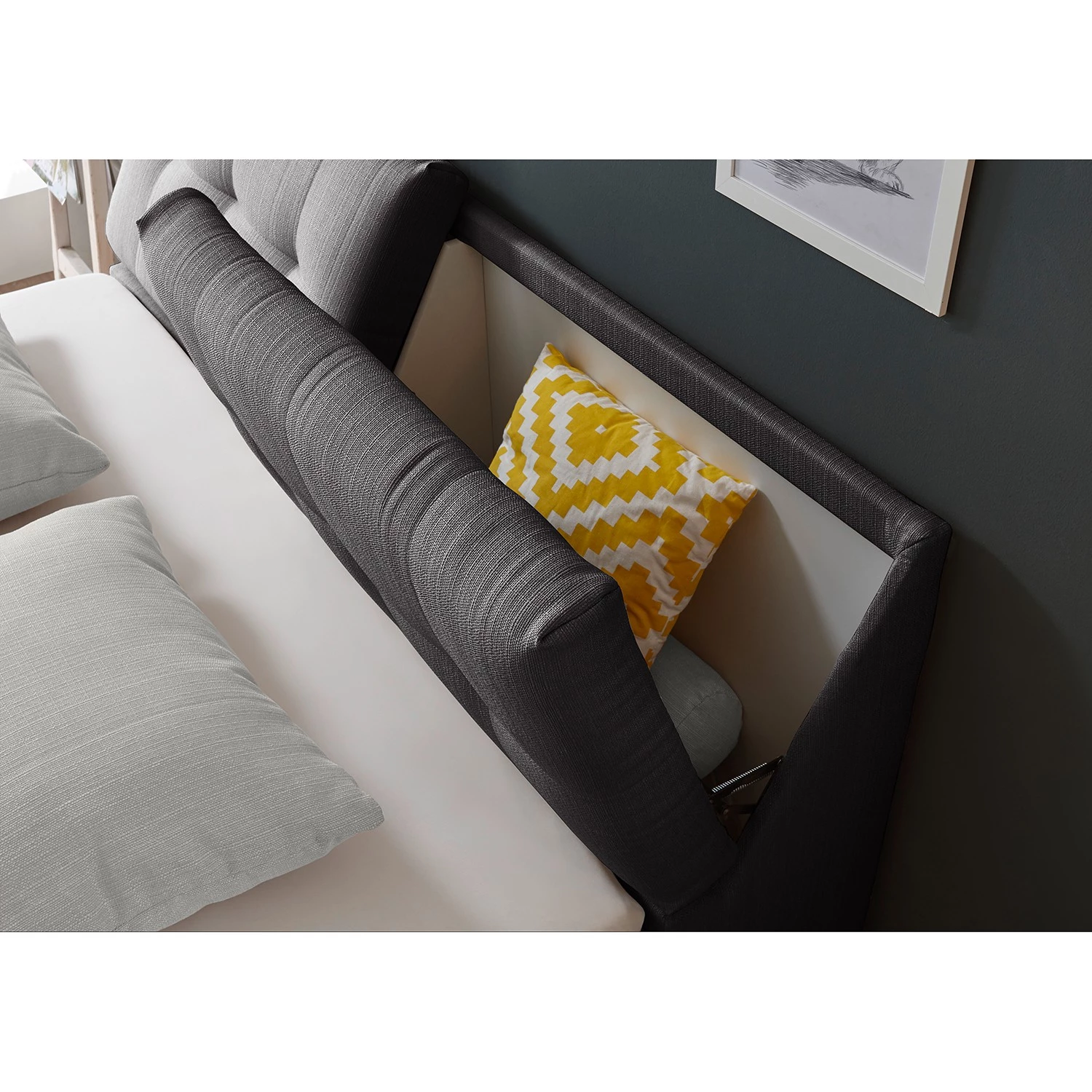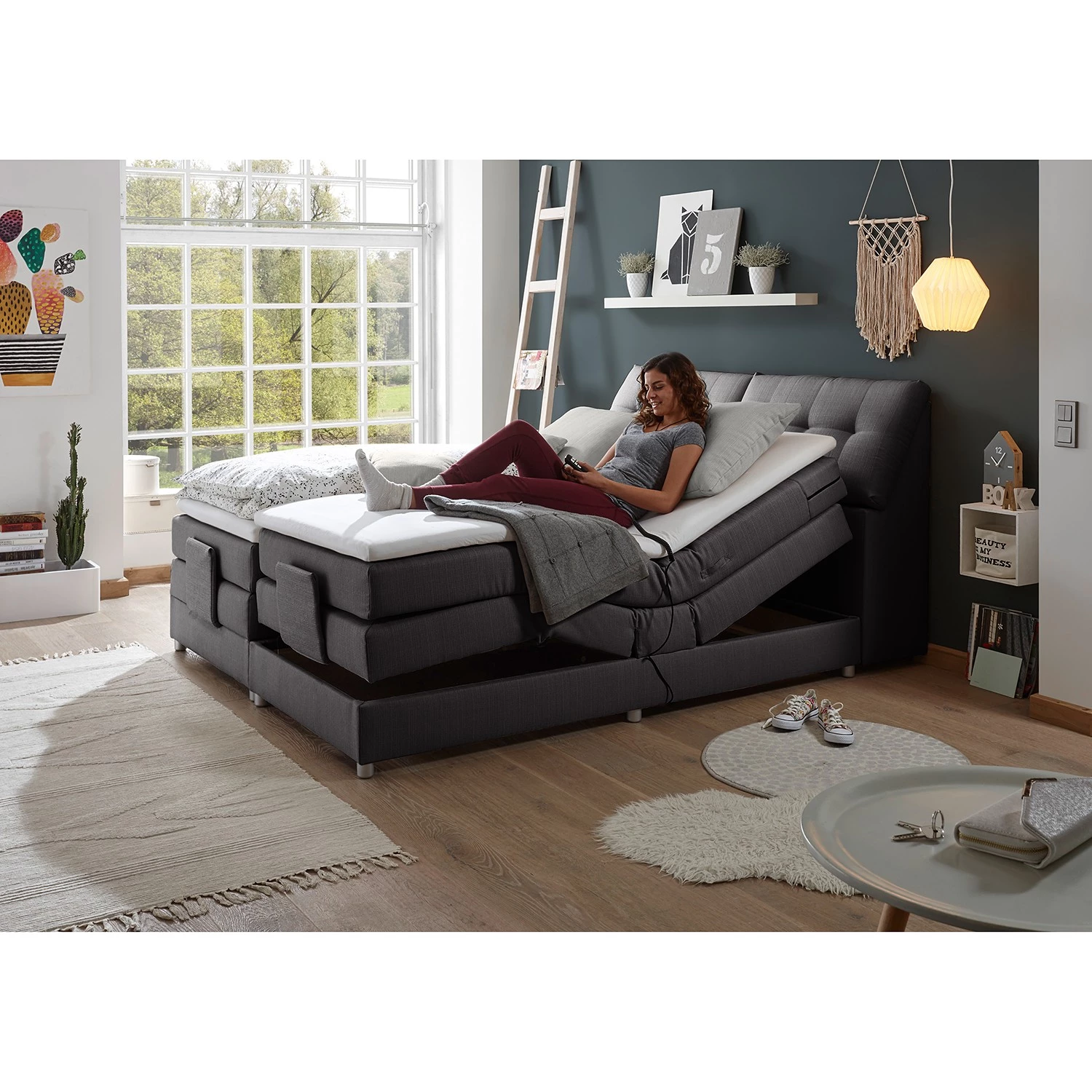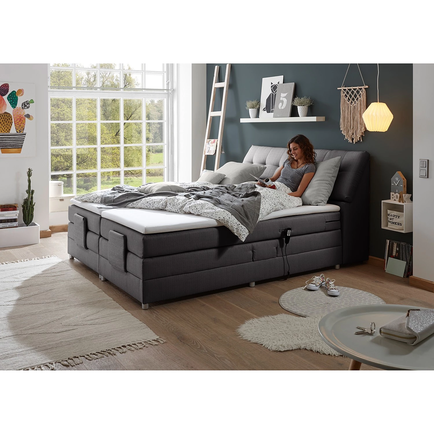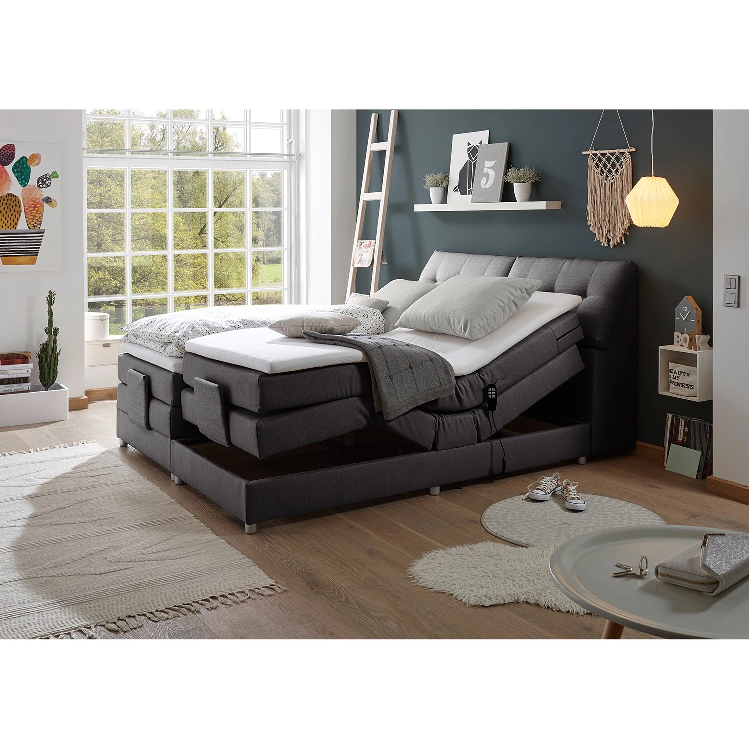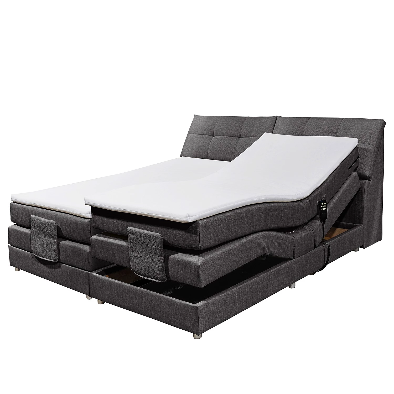 - Contenu de la livraison : Surmatelas, tête de lit, matelas, sommier tapissier à moteur, instructions et matériel de montage