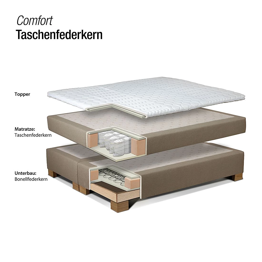 - Lit boxspring confortable avec revêtement textile et surmatelas