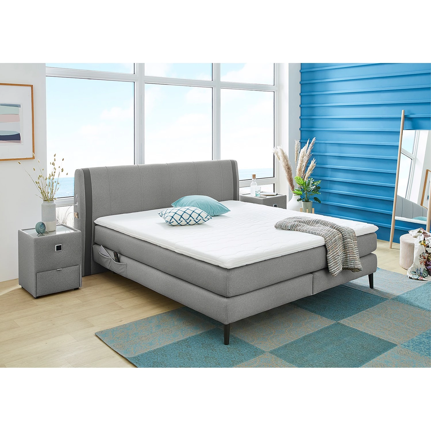 La base du lit boxspring est composée d’un sommier tapissier à ressorts Bonell sur des lattes en bois à ressort. Sur cette base repose un matelas de 7 zones à ressorts ensachés, dans une housse tandem qui empêche les différents éléments de se déplacer les uns par rapport aux autres. La triple suspension ainsi créée offre un confort unique avec une adaptation optimale au corps et une réduction de la pression. Un surmatelas en mousse froide complète l’ensemble. Le lit boxspring permet un excellent confort de sommeil grâce à son très bon maintien individuel. Éclairage LED indirect et port USB de chaque côté du lit. Sur chaque côté se trouvent des rangements pratiques.