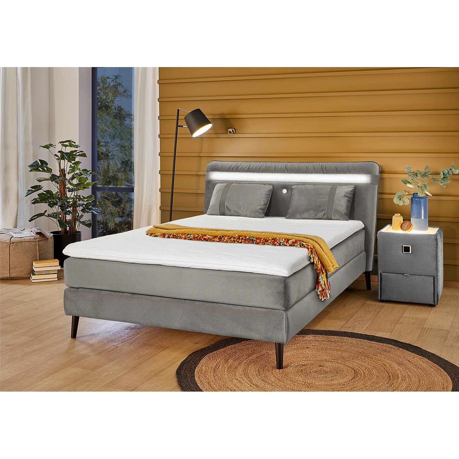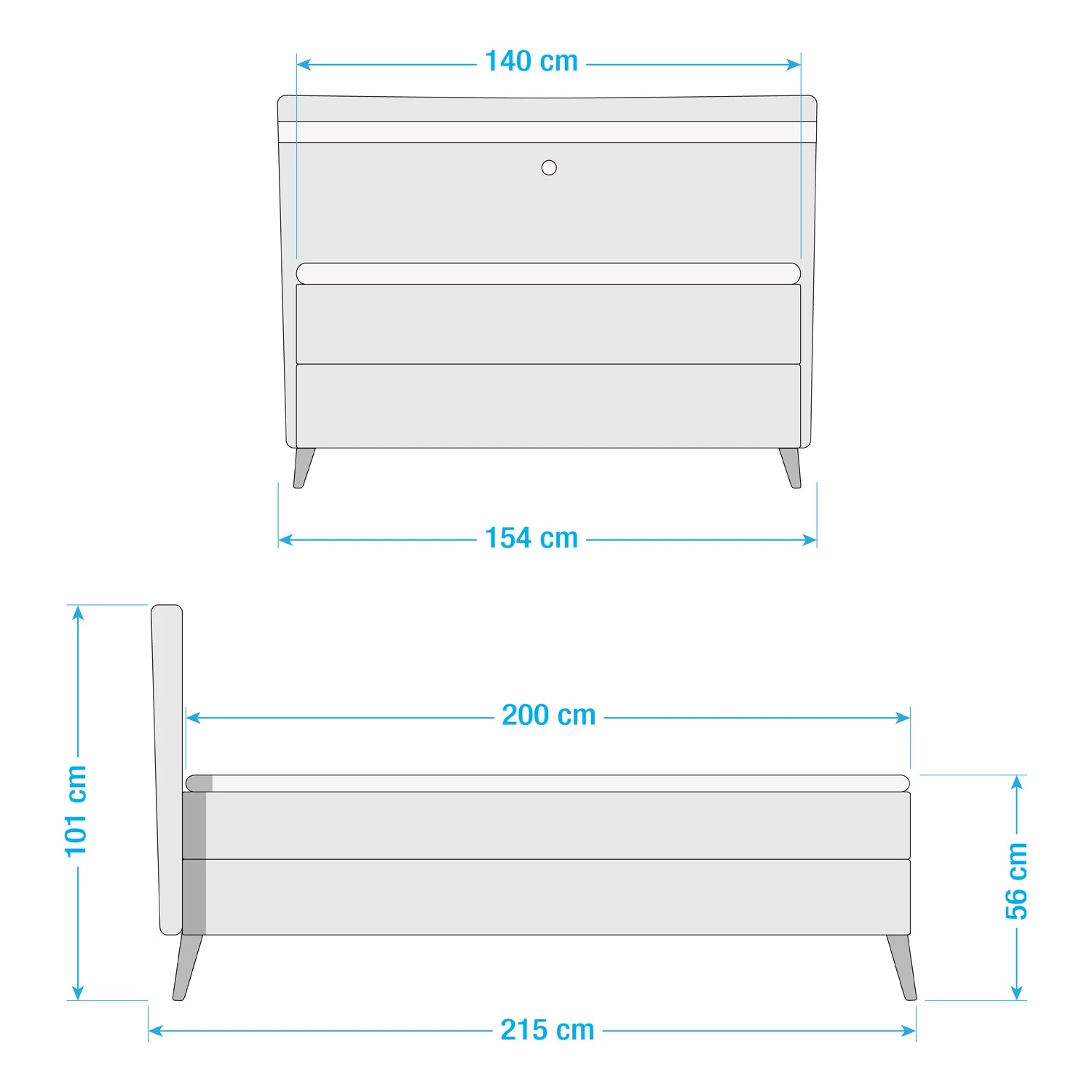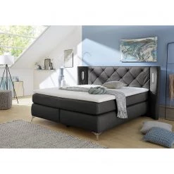 Lit boxspring avec éclairage d’ambiance La base de ce système de sommier tapissier est un rembourrage à ressorts Bonell sur des lattes en bois à ressorts. Un matelas réversible à ressorts Bonell complète l’ensemble. La triple suspension ainsi créée offre un confort unique avec une adaptation optimale au corps et une réduction de la pression. La partie supérieure du lit boxspring est composée d’un surmatelas en mousse PU. Le lit boxspring permet un excellent confort de sommeil. Le matelas réversible Bonell propos les grades de dureté H2 et H3 pour répondre aux besoins de chacun. La livraison comprend 2 petits coussins décoratifs.