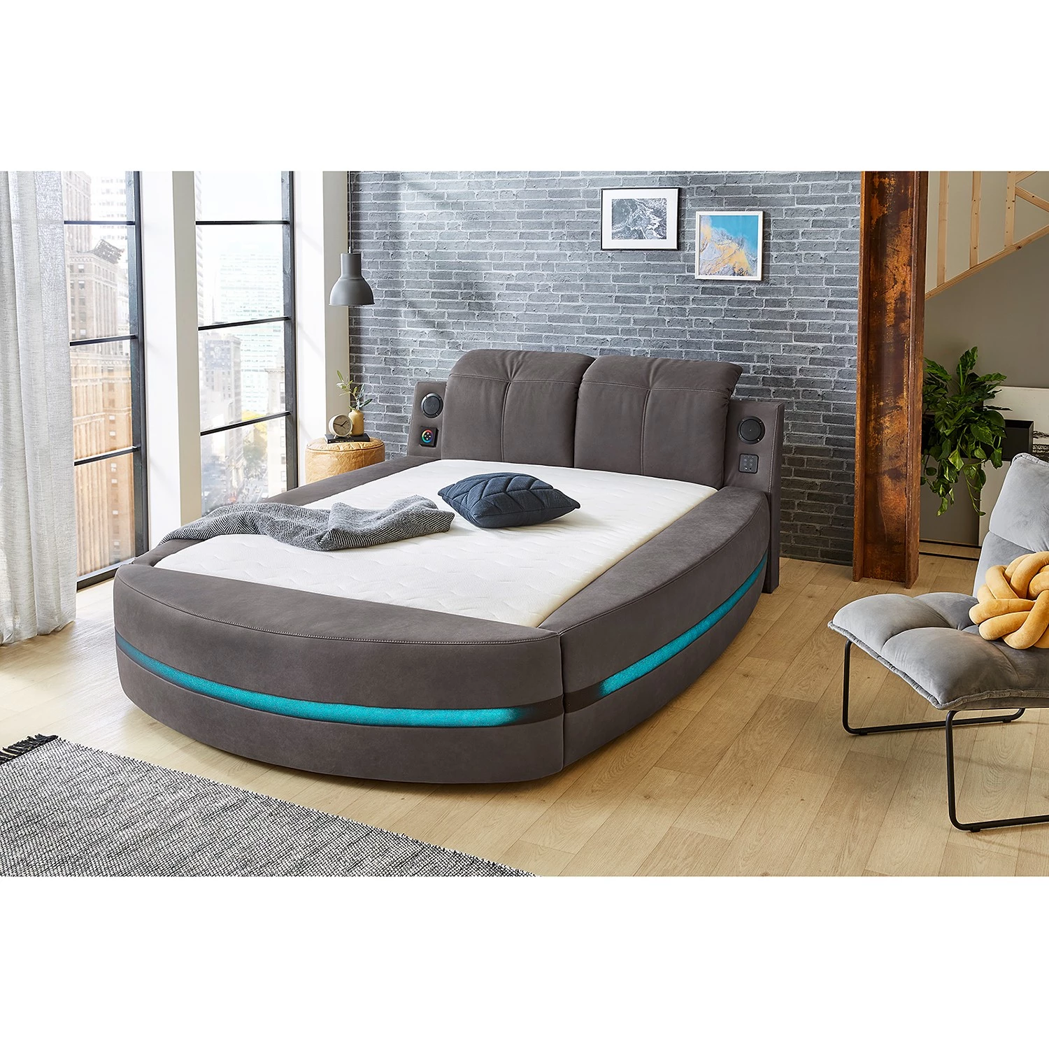La base du lit boxspring est un sommier tapissier à ressorts Bonell, qui est utilisé comme suspension. Sur ce sommier repose un matelas à ressorts de haute qualité avec 7 zones de confort. La double suspension ainsi créée offre un confort unique avec une adaptation optimale au corps et une réduction de la pression. Le surmatelas en mousse froide complète le confort de sommeil. Ce lit boxspring permet un excellent repos grâce à sa double suspension individuelle. Les têtières sont réglables individuellement et séparément. Les panneaux latéraux et le pied de forme arrondie offrent des espaces de rangement supplémentaires. Ce lit offre un éclairage LED multicolore (avec fonction changement de couleur) ainsi qu’un système sonore incluant Bluetooth, interface USB, fonction de chargement USB, connexion AUX-in, etc. La commande s’effectue via le panneau tactile encastré dans la tête de lit.