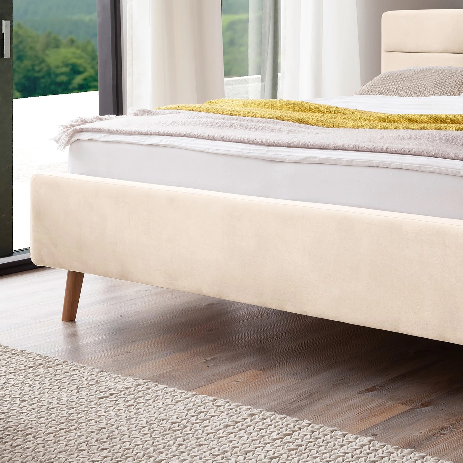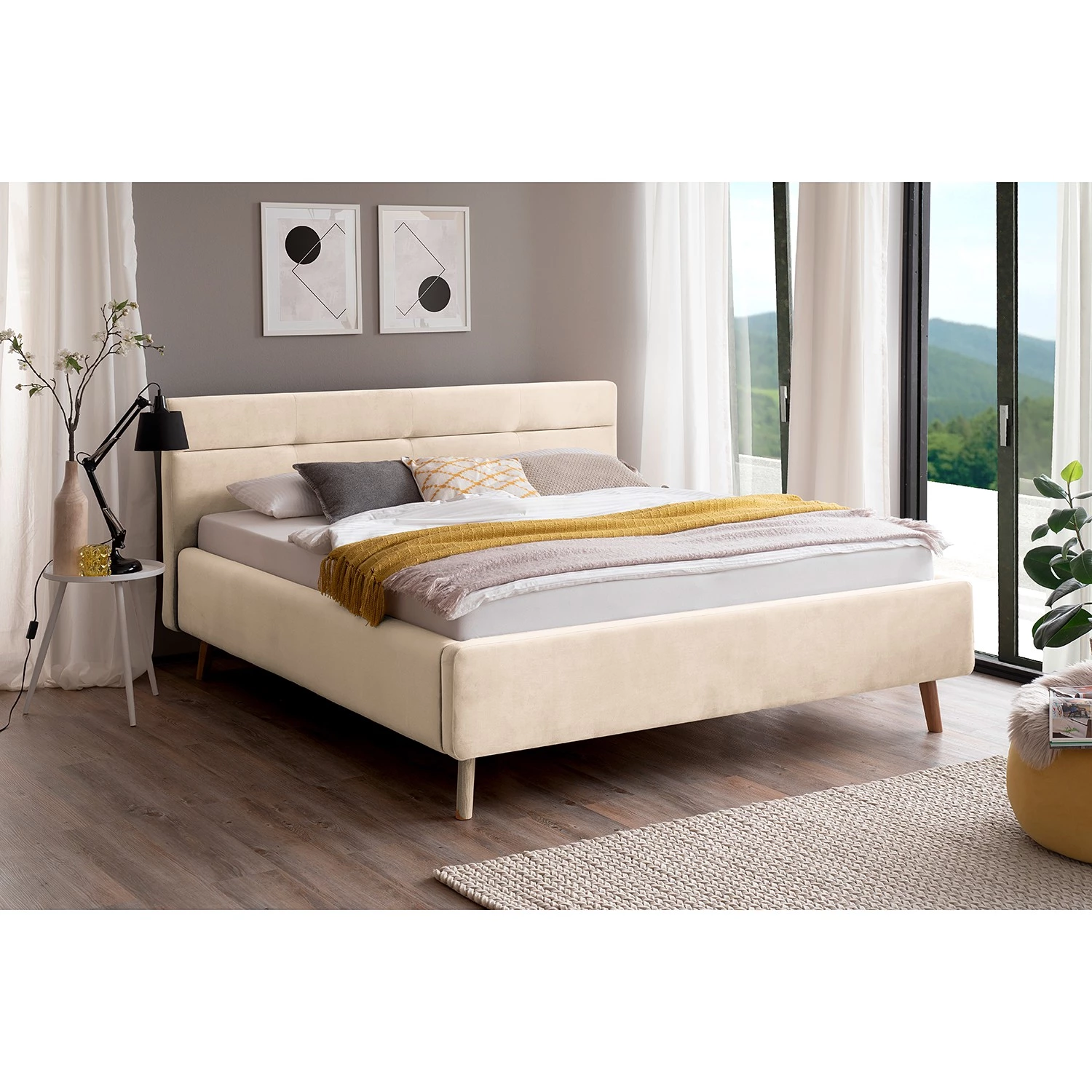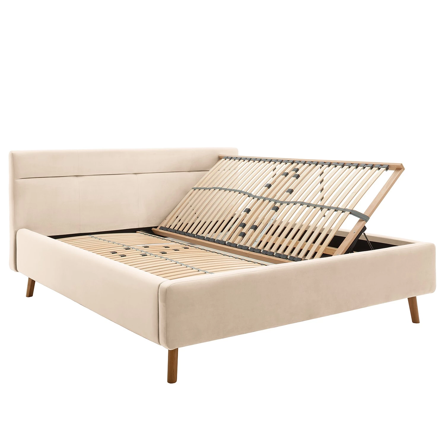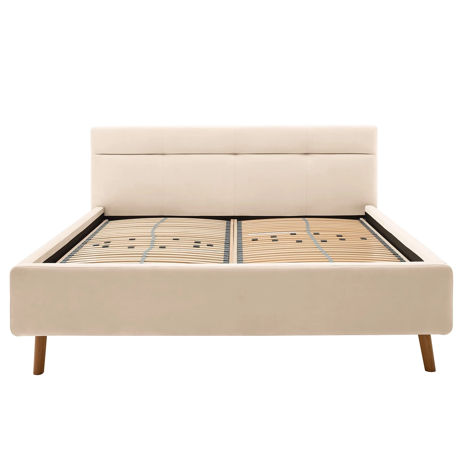 - Contenu de la livraison : Lit capitonné avec tête de lit et sommier à lattes, sans matelas ni accessoires