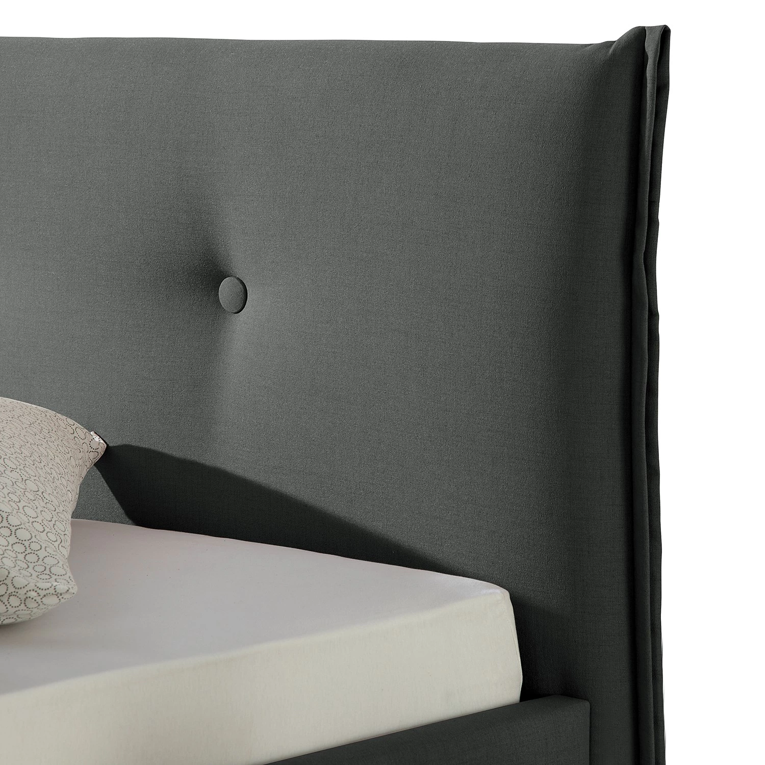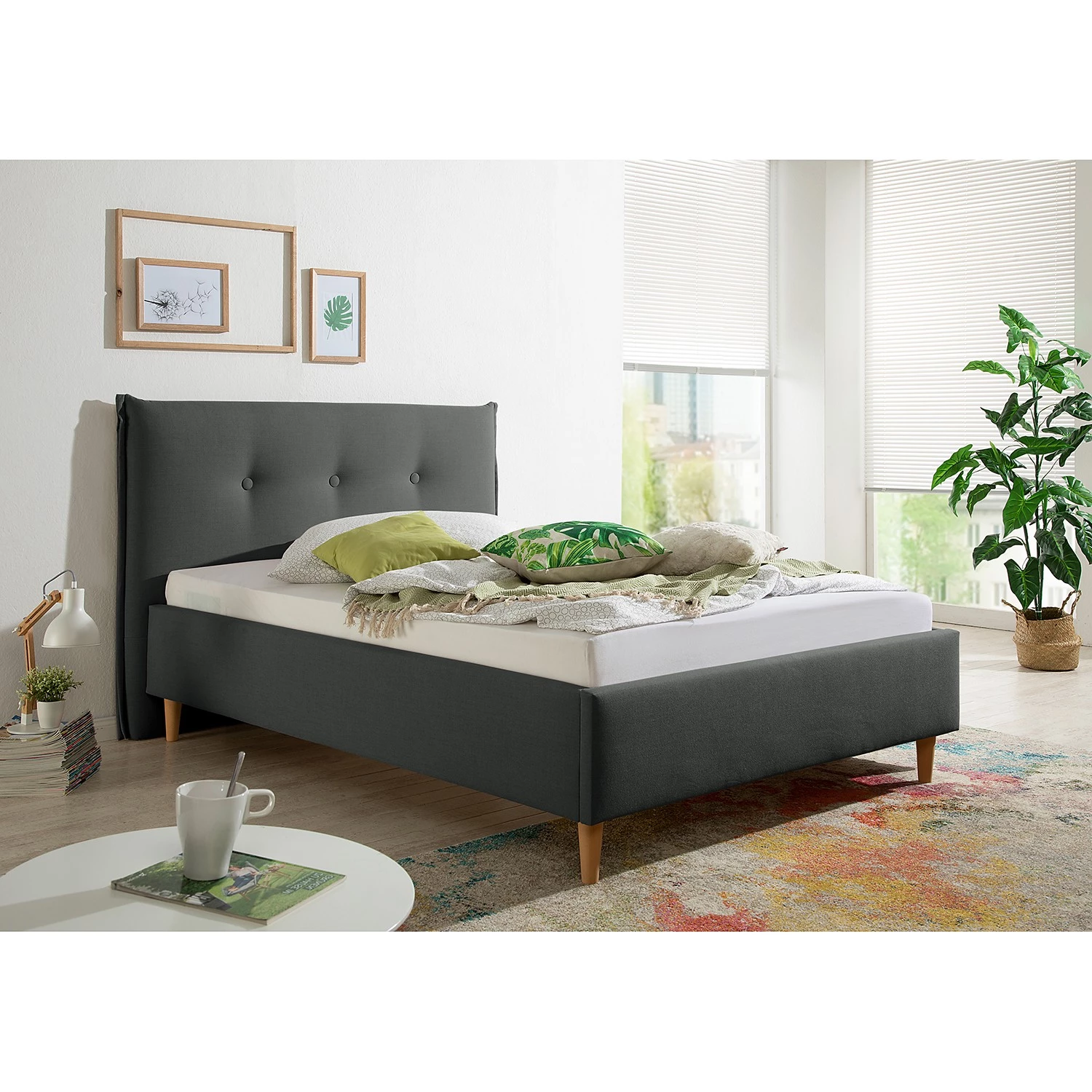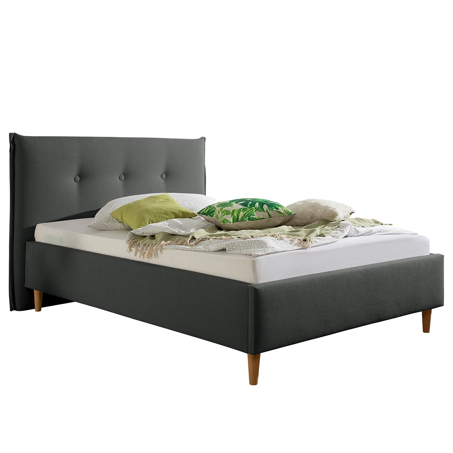 - Autres caractéristiques : Cadre de lit avec tête de lit (avec double passepoil latéral et boutons recouverts de tissu). 4 pieds en bois huilé naturel, 15 cm de haut