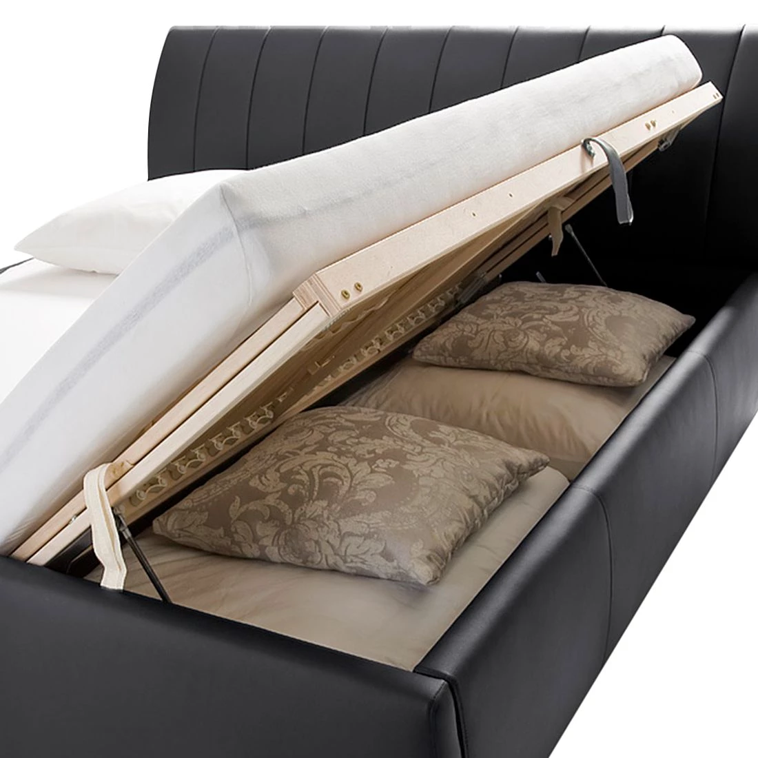 - Coffre à lit inclus et sommier à lattes à ouverture latérale